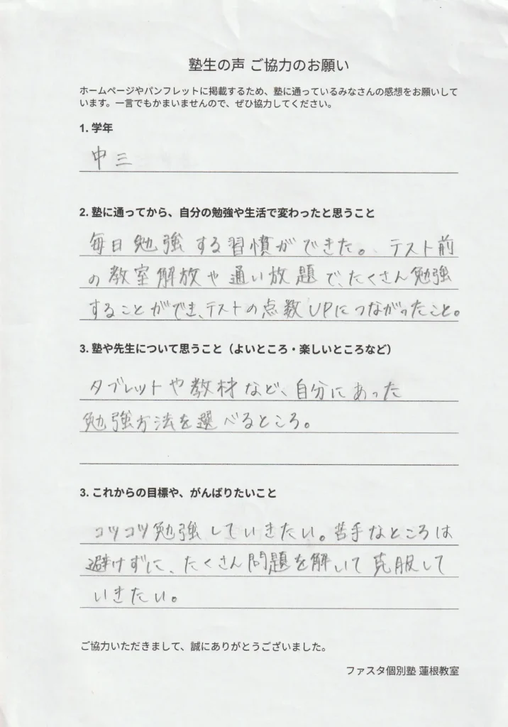 テスト前にたくさん勉強できて、点数が上がった(中学3年生 塾生より) -