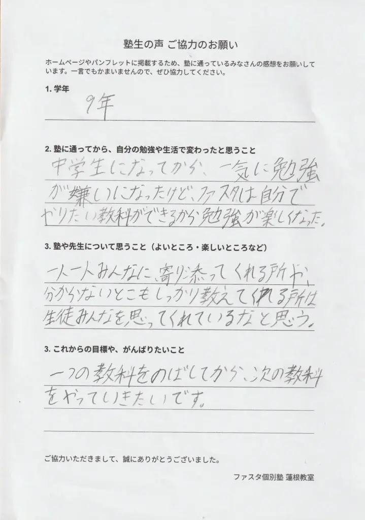▶ 学習面・生活の変化中学生になってから、一気に勉強が嫌いになったけど、ファスタは自分でやりたい教科ができるから勉強が楽しくなった。 ▶ 塾や講師に対する印象一人一人みんなに寄り添ってくれる所や、分からないところもしっかり教えて... -
