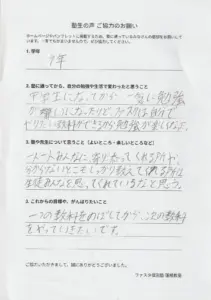 先生はとてもやさしいです。わからないこともわかりやすくていねいにおしえてくれるので、すぐなっとくして勉強する時間が多くなりました。