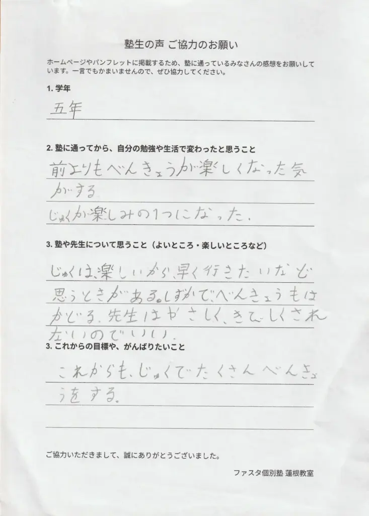 じゅくが楽しみの1つになった(小学5年生 塾生より)